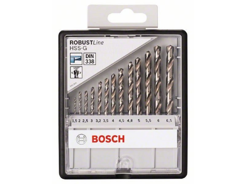 Karakteristike Bosch 2607010538 osobine 13-delni Robust Line set burgija za metal HSS-G, DIN 338, 135° 1,5 2 2,5 3 3,2 3,5 4 4,5 4,8 5 5,5 6 6,5 mm, 135° Tehničke karakteristike Prečnik mm 1,5 Prečnik