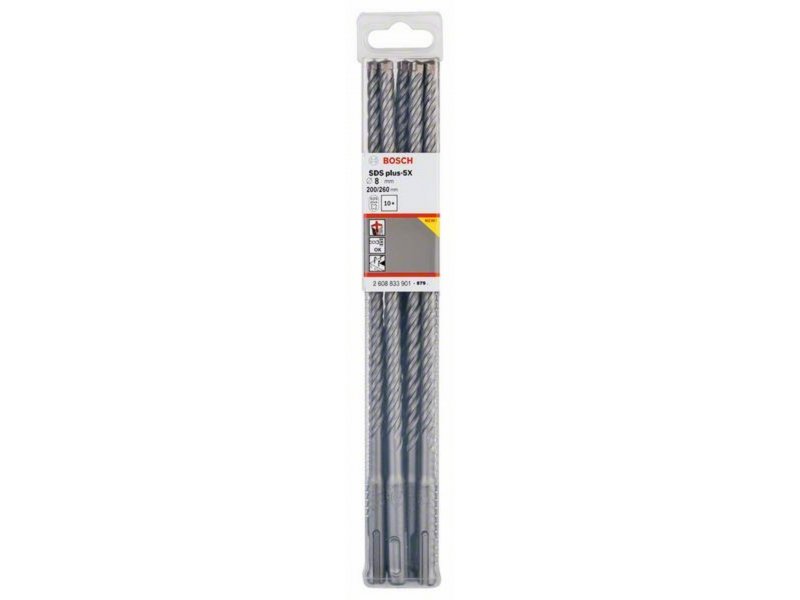 Karakteristike Bosch 2608833901 osobine Pakovanje od 10 komada 8 x 200 x 260 mm Tehničke karakteristike Prečnik D mm 8,00 Radna dužina L1 mm 200 Ukupna dužina L2 mm 260 Pogodno za Beton armirani beton Beton