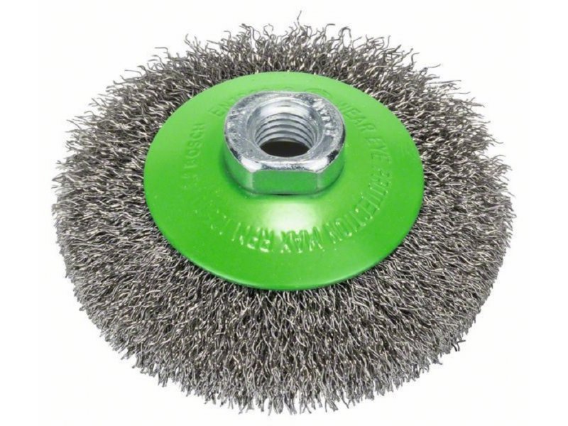 Karakteristike Bosch 2608622108 osobine Konusna četka – talasasta žica, nerđajuća Optimalno prikladna za obradu teško pristupačnih mesta zahvaljujući konusnom obliku četke . Prikladna za lake do srednje