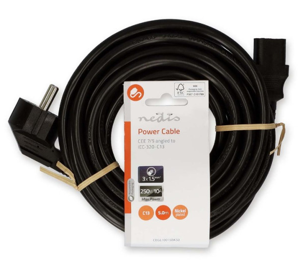 Utikač sa uzemljenjem muški | IEC-320-C13 | Ugaoni | Pravi | Niklovani | 5,00 m | Okrugli | PVC | Crni | Oznaka