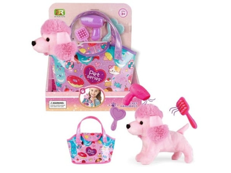 Karakteristike Roze pli šana kuca sa ljubičastom torbicom i dodacima za igru Sve što je potrebno za brigu o tvom kućnom ljubimcu Set sadrži plišanu kucu, ljubičastu torbicu, češalj, fen