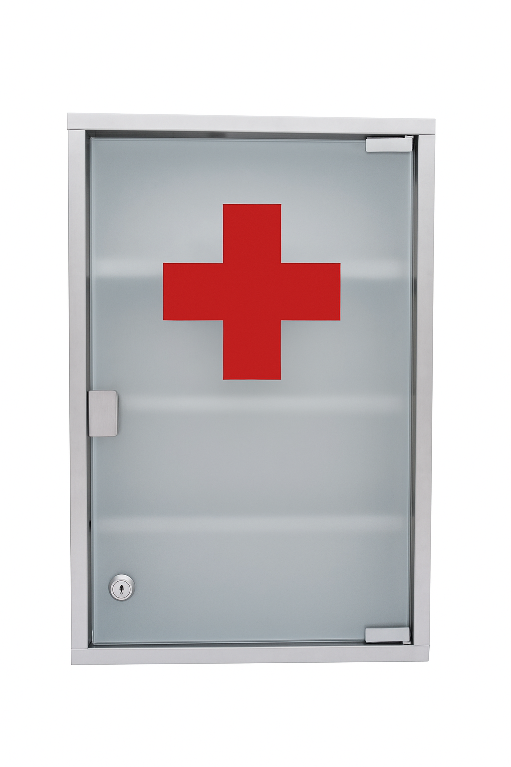 Na vratima je transparentan krst (kao oznaka prve pomoći). Uz ormarić